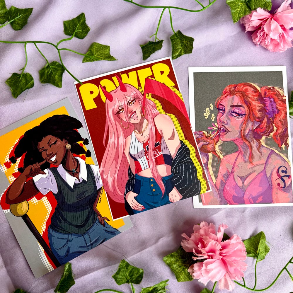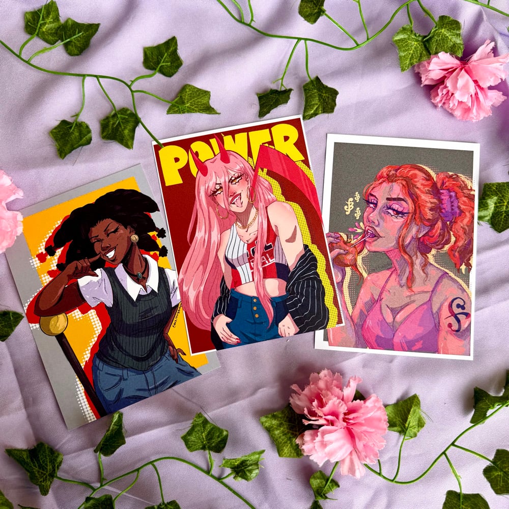 5x7 prints of Canary, Power and Nami printed on light cardstock.